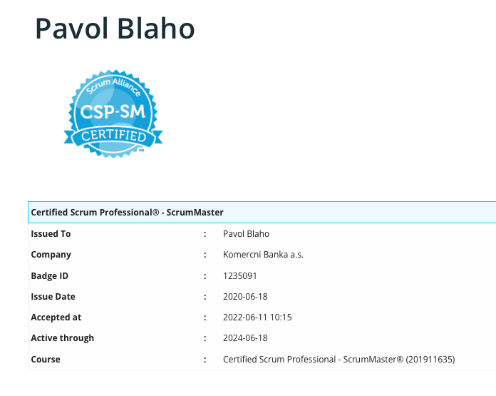 | Certified SCRUM Master | Scrum Alliance | 16 | Bez ICF akreditace | 2016 | Náhled |